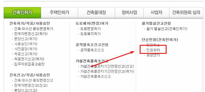 아래 예를 참고해서 건축인허가에서 진행한 건이면 건축인허가 > 민원취하에서 민원 진행하는 식으로 접근