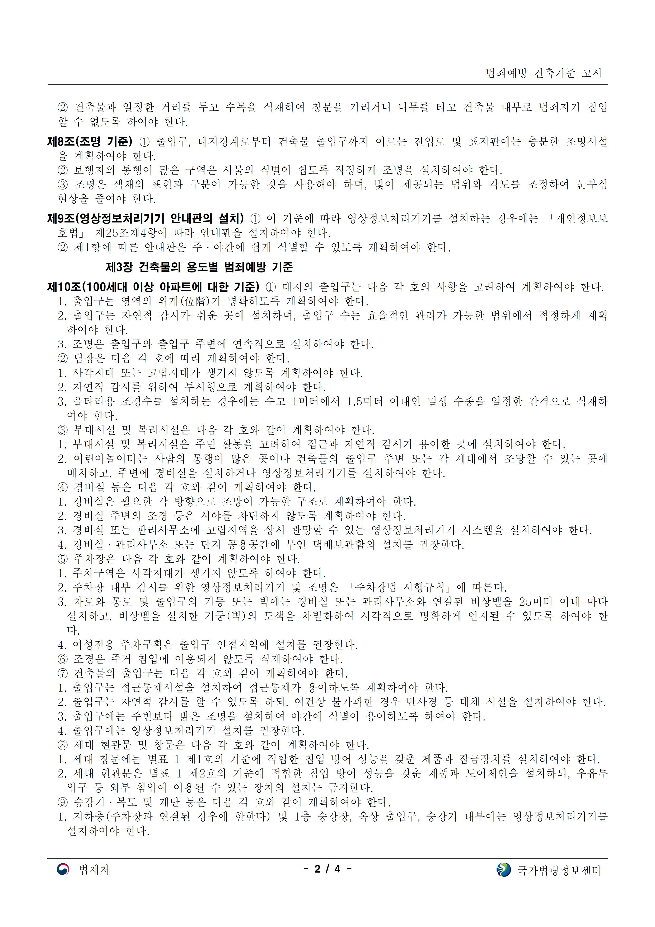 제53조의2(건축물의 범죄예방) ① 국토교통부장관은 범죄를 예방하고 안전한 생활환경을 조성하기 위하여 건축물, 건축설비 및 대지에 관한 범죄예방 기준을 정하여 고시할 수 있다. (아래 고시 내용 참고)